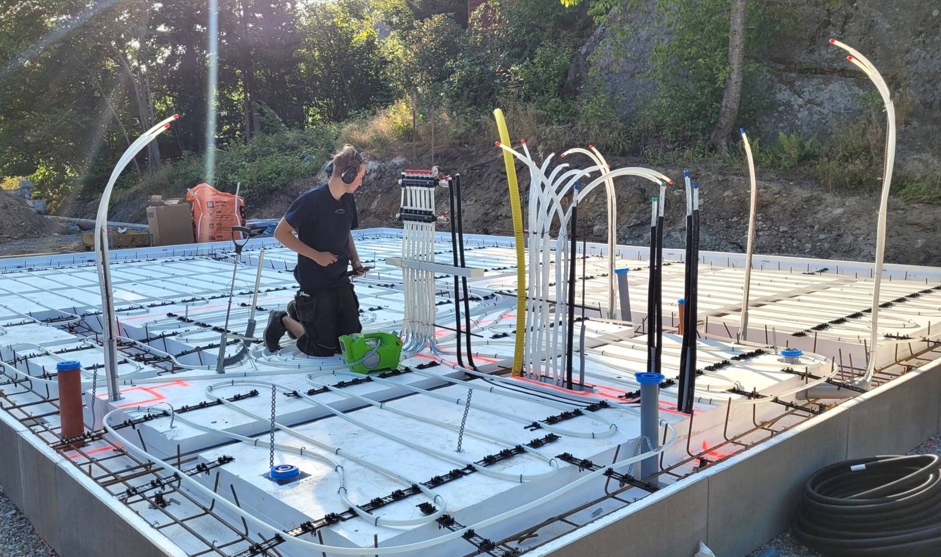 Vid nyproduktion installeras rör i plattan innan och kopplas på vid anslutningspunkter som leds sedan till golvvärmefördelaren, där värmen regleras för optimal komfort.